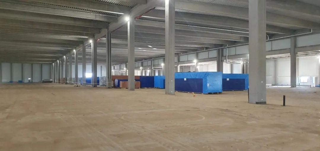 一期主體廠房內(nèi)部,工業(yè)地板混凝土已經(jīng)完成,雨水排放管線已安裝完畢,正進入設(shè)備安裝階段。