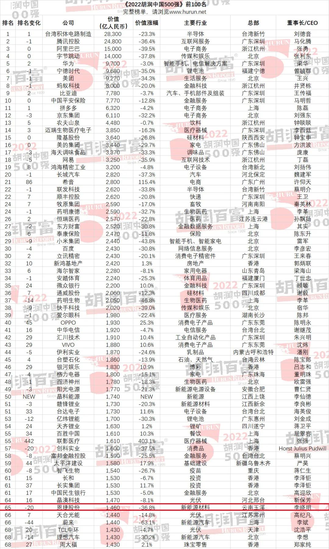 第65名!恩捷股份榮登2022胡潤(rùn)中國(guó)500強(qiáng)