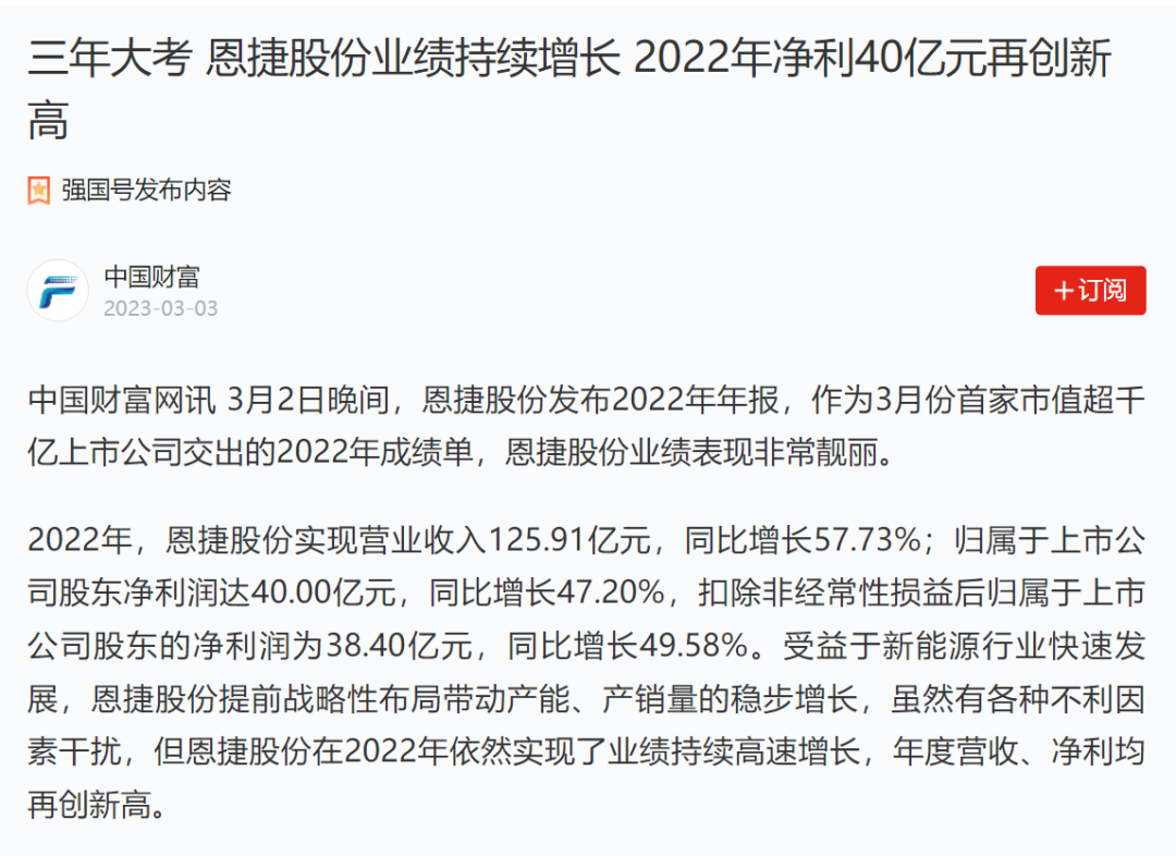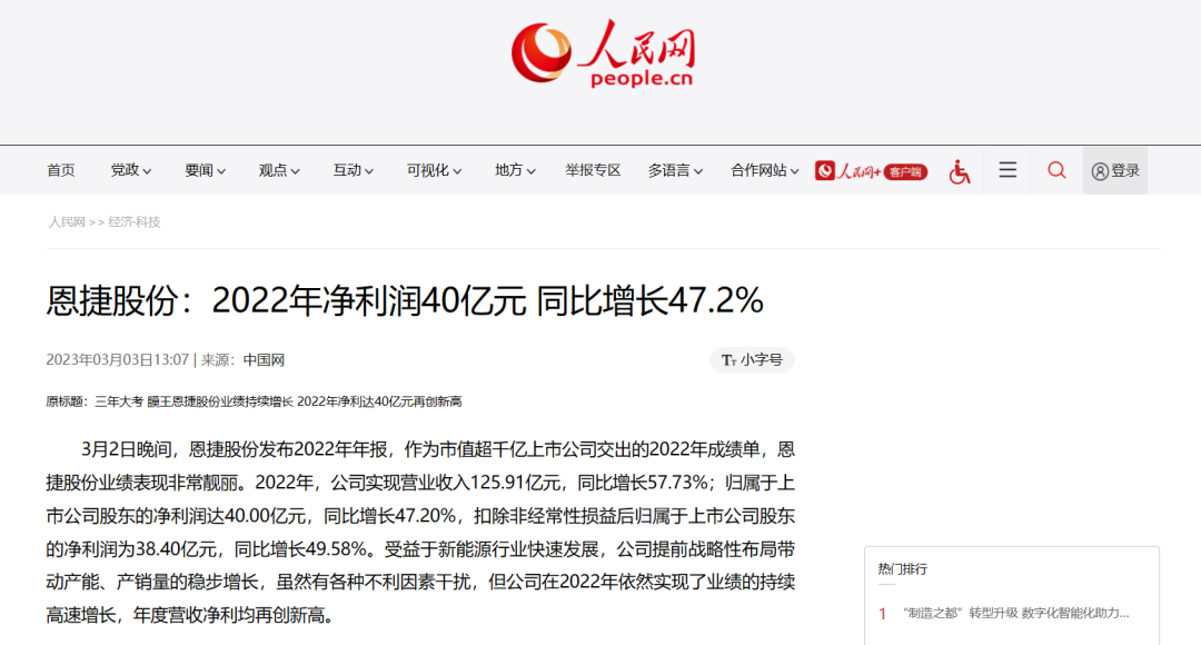 近日,恩捷股份發(fā)布2022年年度報告,人民網(wǎng)、新華社、學(xué)習(xí)強國、中國財富網(wǎng)等多家媒體深度報道恩捷2022年的靚麗成績單。