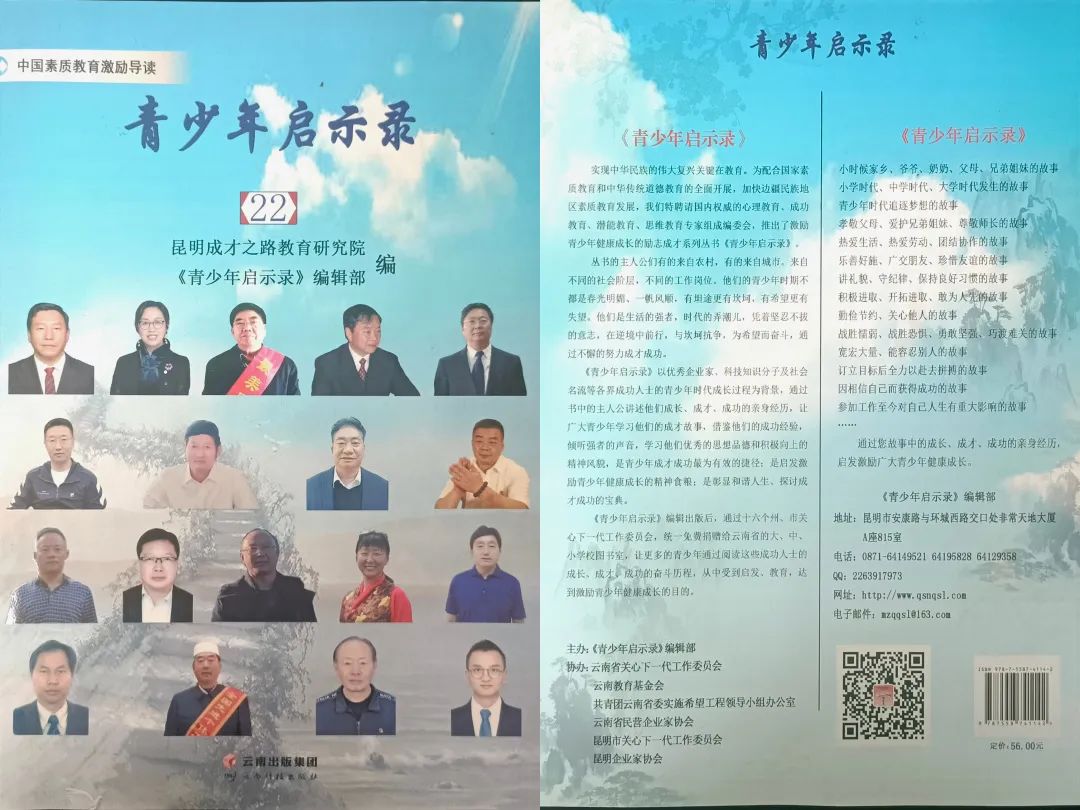 《青少年啟示錄》由云南省關(guān)工委思想道德委員會、青少年啟示錄編輯部主辦,是一部彰顯和諧人生、探討青少年成長成才的寶典,是啟發(fā)激勵青少年健康成才的精神食糧,將通過云南省關(guān)工委統(tǒng)一捐贈給貧困山區(qū)的中小學,讓更多的青少年從中獲得啟發(fā)、受到教育,不斷奮斗健康成長。