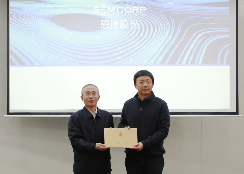 上海市政協(xié)副主席壽子琪(左一)為恩捷股份副董事長(zhǎng)兼執(zhí)行總裁李曉華(右一)送上“服務(wù)包”