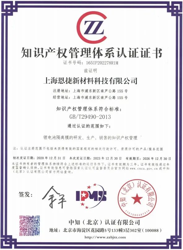 近幾年,恩捷承擔(dān)了數(shù)項“國家重點研發(fā)計劃”、“國家重點技術(shù)改造”、“國家制造業(yè)高質(zhì)量發(fā)展”等項目,先后獲得“國家知識產(chǎn)權(quán)優(yōu)勢企業(yè)”、“上海市專利工作示范企業(yè)”等認(rèn)定;其主要產(chǎn)品鋰電池隔膜的研發(fā)、生產(chǎn)等管理通過“GB/T29490-2013知識產(chǎn)權(quán)管理體系”認(rèn)證。