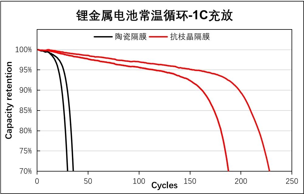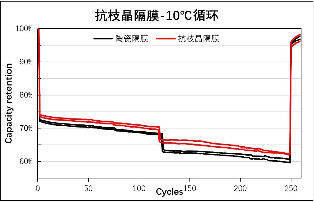 經(jīng)測試,相較于傳統(tǒng)陶瓷隔膜,抗枝晶隔膜能夠提升電池循環(huán)性能、安全性能,在常溫和低溫-10℃下充放電循環(huán)測試表現(xiàn)出明顯優(yōu)勢。