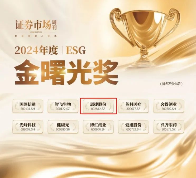 近日,恩捷股份憑借在ESG領(lǐng)域的卓越表現(xiàn),榮獲《證券市場周刊》“2024年度ESG金曙光獎”。