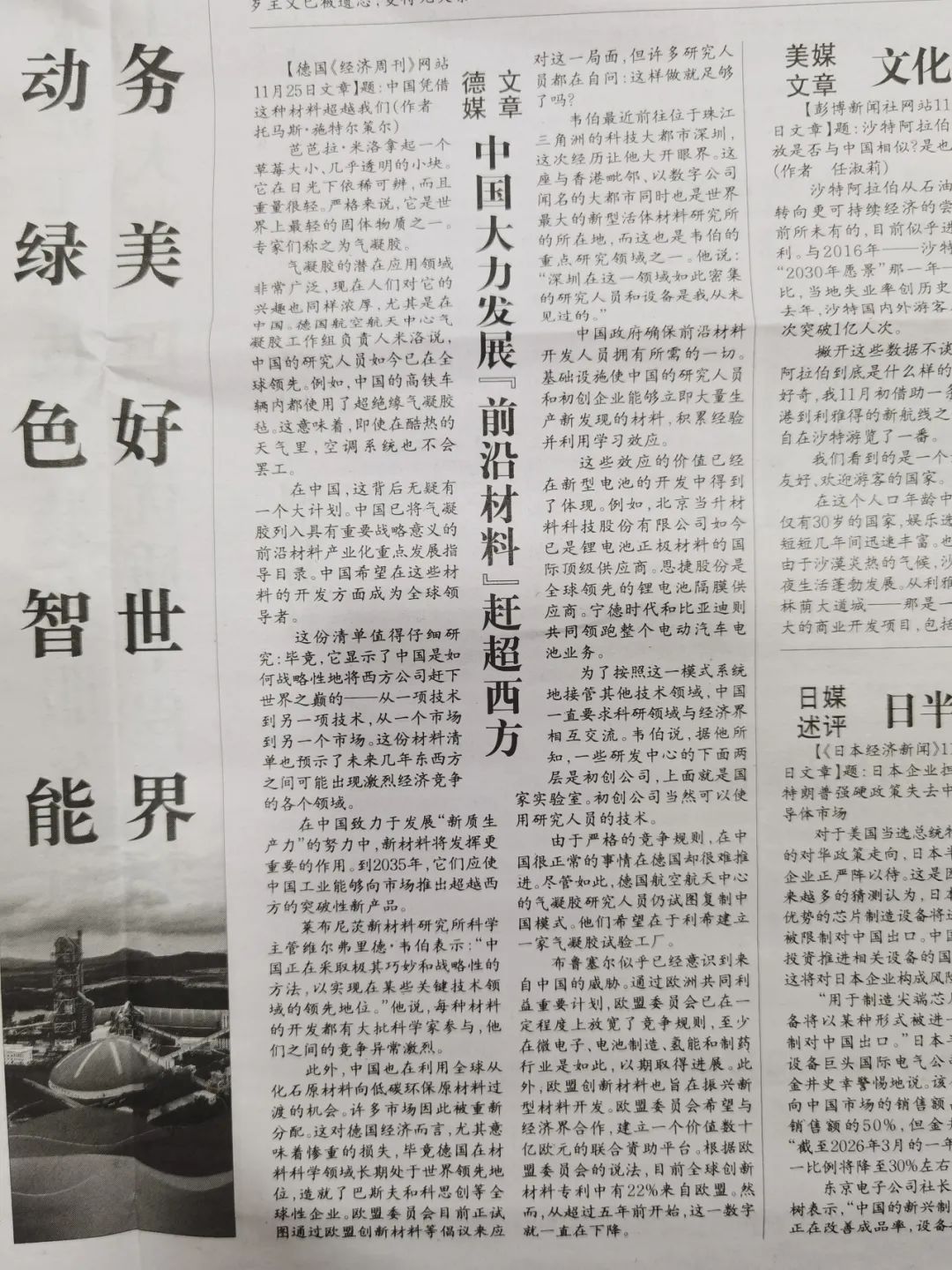 近日,新華通訊社旗下的《參考消息》報轉(zhuǎn)載并發(fā)布了德國《經(jīng)濟周刊》文章,題為《中國大力發(fā)展前沿新材料趕超西方》。該文章認為新材料將在中國未來“新質(zhì)生產(chǎn)力”的發(fā)展中發(fā)揮更重要作用,并對恩捷股份在全球鋰電池行業(yè)所占據(jù)的領(lǐng)先地位給予了肯定。