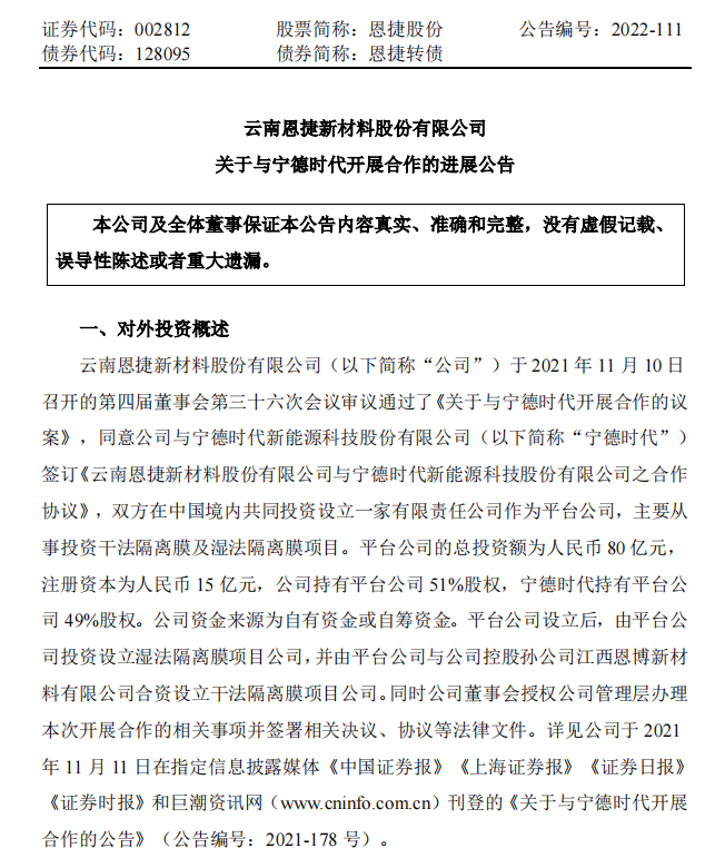 6月20日,恩捷股份晚間披露與寧德時代開展合作的進展公告,由恩捷股份與寧德時代合資的平臺公司將在廈門火炬高技術產(chǎn)業(yè)開發(fā)區(qū)管理委員會、廈門市同安區(qū)人民政府雙方共管區(qū)域內(nèi)建設項目公司,項目公司暫定名為“廈門恩捷新材料科技有限公司”,擬注冊資本為16億元。