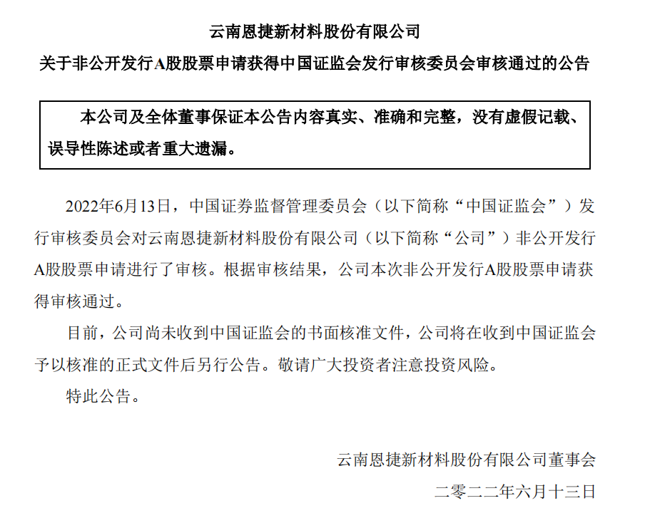 6月13日,中國證券監(jiān)督管理委員會(huì)發(fā)行審核委員會(huì)對(duì)恩捷股份(云南恩捷新材料股份有限公司)非公開發(fā)行A股股票申請(qǐng)進(jìn)行了審核。根據(jù)審核結(jié)果,恩捷股份本次非公開發(fā)行A股股票申請(qǐng)獲得審核通過。