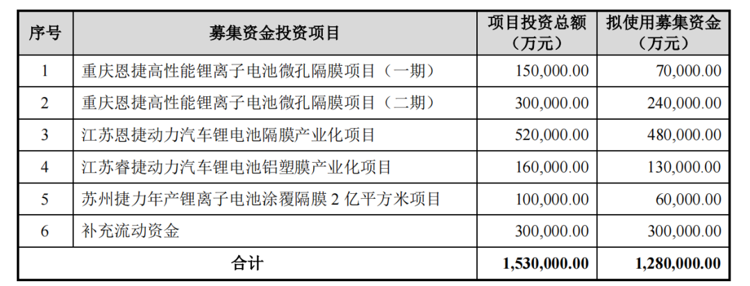 2021年11月,恩捷股份披露非公開發(fā)行預(yù)案,擬向不超過35名特定投資者非公開發(fā)行股票數(shù)量不超過267,721,996股,預(yù)計(jì)募資不超128億元,將用于重慶恩捷高性能鋰離子電池微孔隔膜項(xiàng)目、江蘇恩捷動(dòng)力汽車鋰電池隔膜產(chǎn)業(yè)化項(xiàng)目、江蘇睿捷動(dòng)力汽車鋰電池鋁塑膜產(chǎn)業(yè)化項(xiàng)目、蘇州捷力年產(chǎn)鋰離子電池涂覆隔膜2億平方米項(xiàng)目及補(bǔ)充流動(dòng)資金。