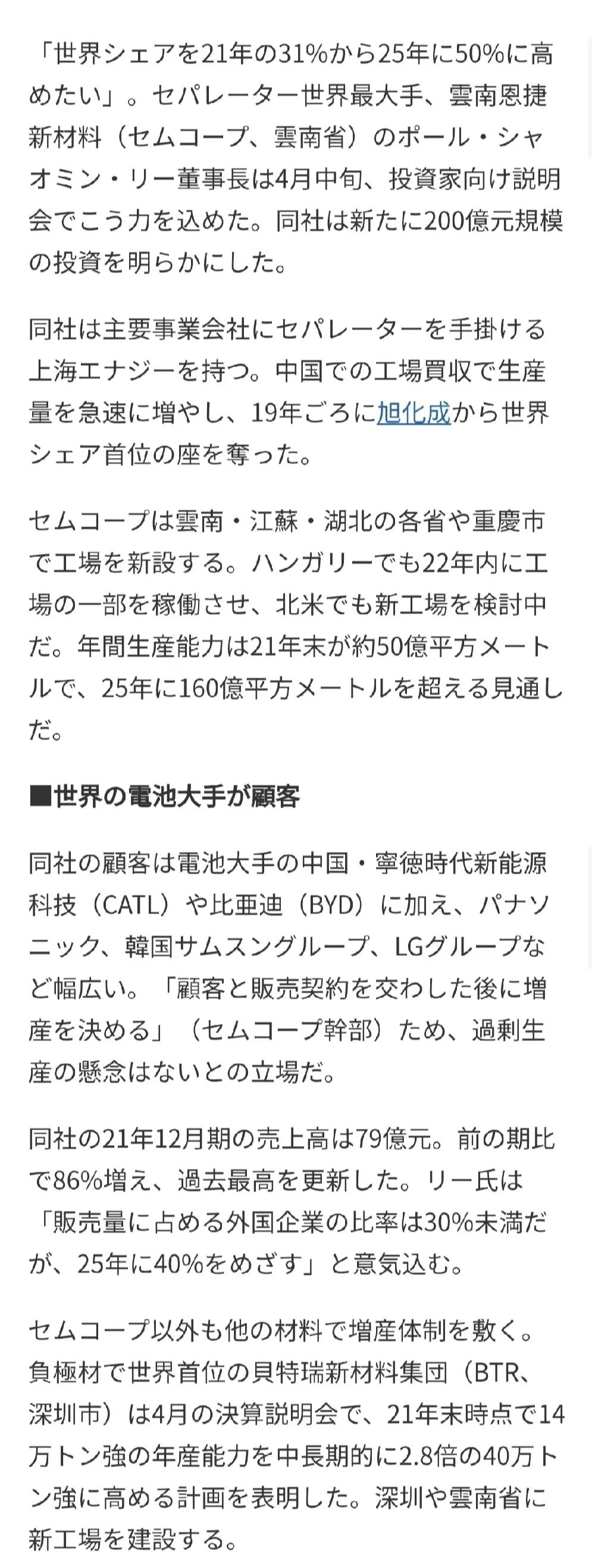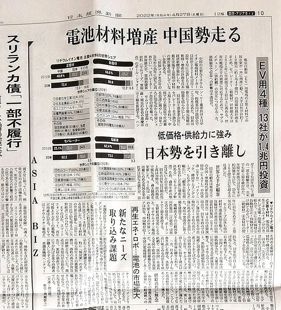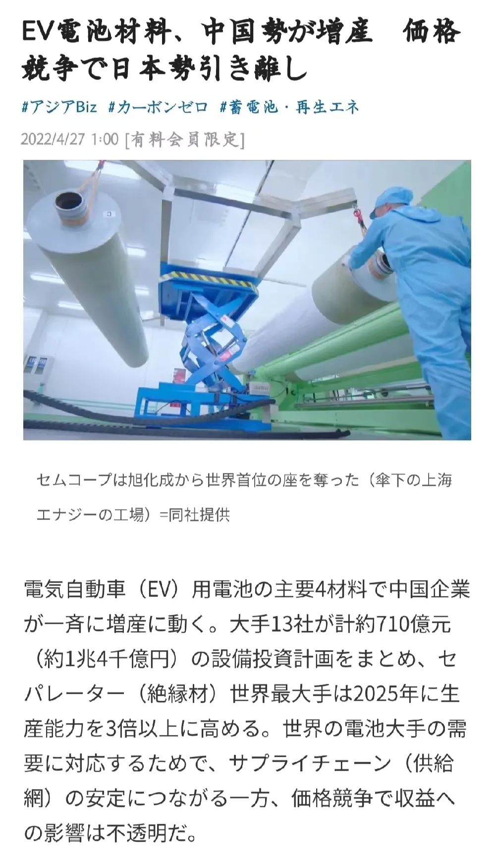 近日,日本最大的財(cái)經(jīng)類媒體——《日本經(jīng)濟(jì)新聞》(NIKKEI)重磅報(bào)道了全球電動(dòng)車材料產(chǎn)業(yè),突出報(bào)道了恩捷股份的戰(zhàn)略,并將該報(bào)道刊登在“亞洲經(jīng)濟(jì)板塊”頭條。